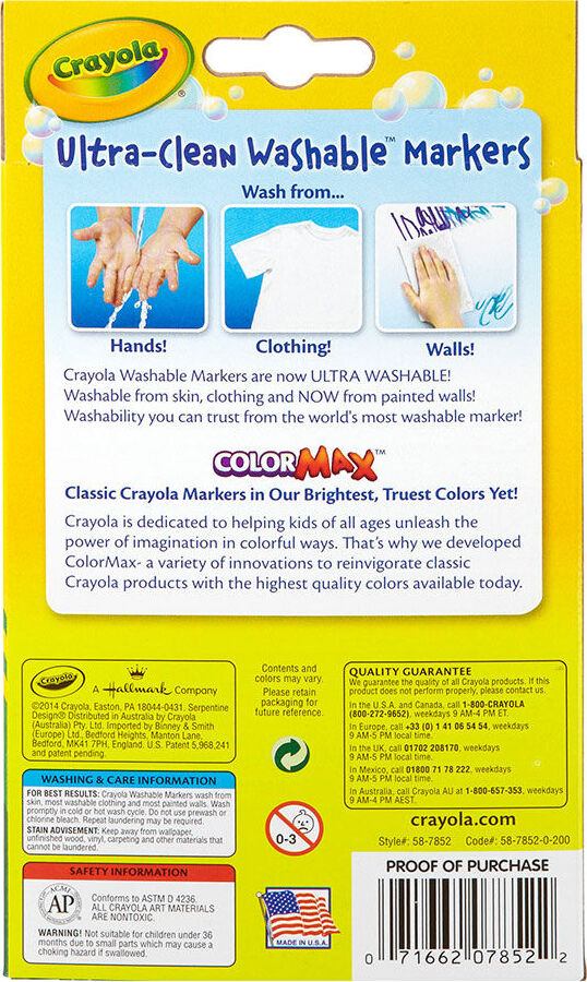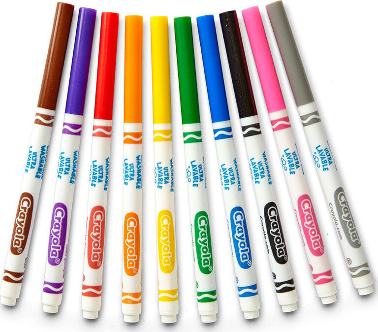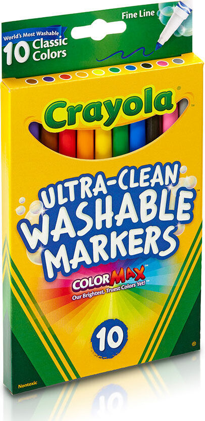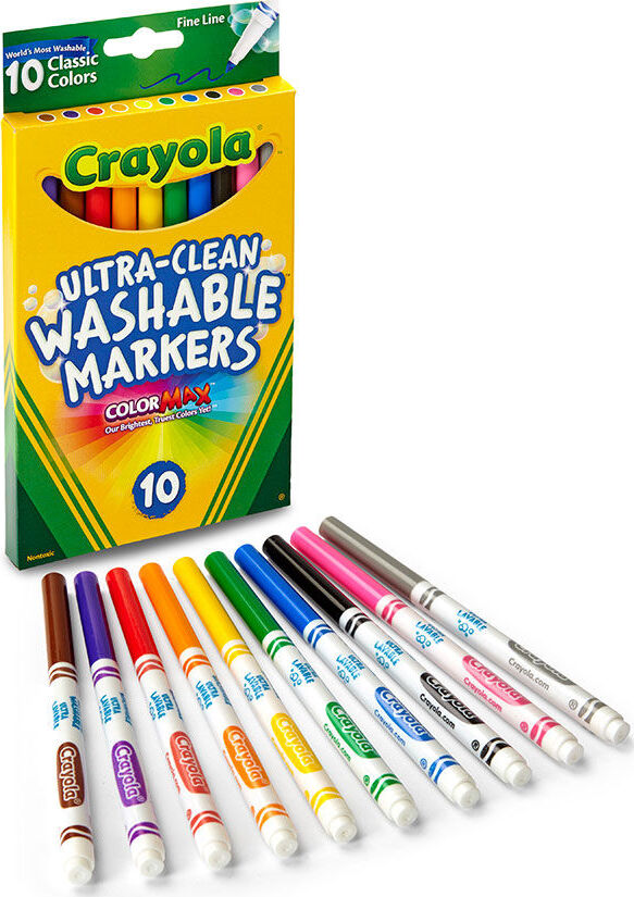 | Features | CRAYOLA COLOR MAX — TRUE, VIBRANT COLORS: Fine Line Markers provide artists with 10 classic Crayola colors that feature Color Max – our brightest, truest colors yet. Amp up school projects and artistic endeavors with high-quality ink that is true to color. The variety of bright, classic colors in this pack invites imaginative expression. FINE TIP MAKES THIN, PRECISE LINES: With its slender tip, the Fine Line Marker is a precise drawing tool. Perfect for coloring in small areas, these markers are also great for writing or drawing thin lines or dots. These markers lay down plenty of vibrant color and won't smudge or bleed through paper. ULTRA-CLEAN MARKERS FOR SUPERIOR WASHABILITY: The world's most washable non-toxic markers now come in an improved Ultra-Clean formula that washes easily from skin, clothing, and common household surfaces—even painted walls. MADE FROM RECYCLED PLASTIC: Crayola Markers contain recycled plastic resin, which keeps hundreds of tons of plastic out of landfills every year. Bring beauty and color to your world and help keep plastic out of landfills. PACKAGE CONTENTS: Crayola Ultra-Clean Fine Line Markers, Classic Colors, 10 Count. |