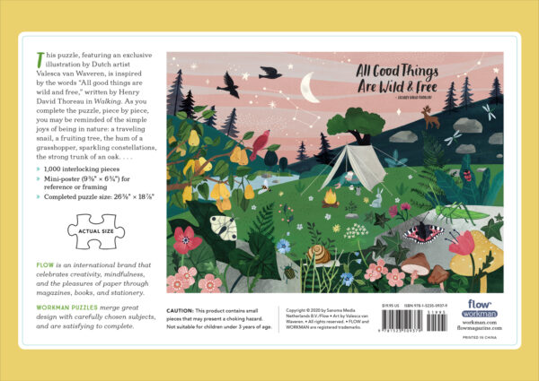 This puzzle, featuring an exclusive illustration by Dutch artist Valesca van Waveren, is inspired by the words “All good things are wild and free,” written by Henry David Thoreau in Walking. As you complete the puzzle, piece by piece, you may be reminded of the simple joys of being in nature: a traveling snail, a fruiting tree, the hum of a grasshopper, sparkling constellations, the strong trunk of an oak…