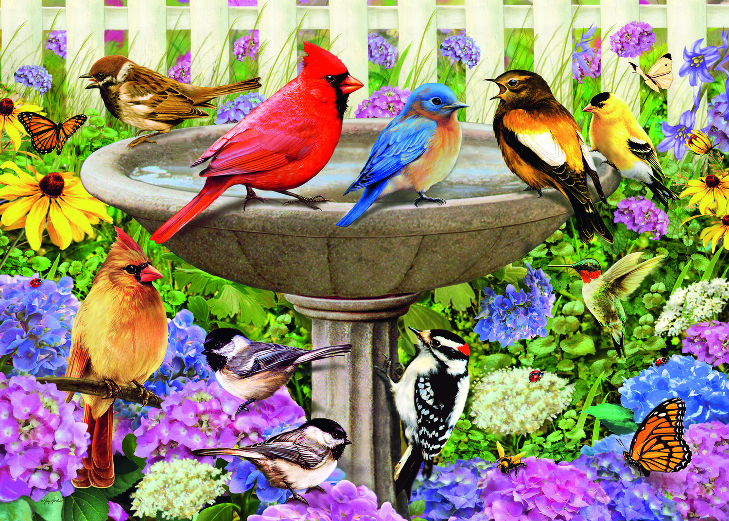 Nestled among multi-hued hydrangeas and sunny-yellow rudbeckia, this lovely birdbath is the place colorful feathered friends flock to! Mr. Evening Grosbeak seems to be on a roll about something, while the Northern Cardinal and Eastern Bluebird patiently wait to get a word in edgewise. The sparrow may be muttering to the passing monarch butterfly, but the American Goldfinch just came for a quick drink and is staying out of it. Fun for all and a perfect puzzle for any bird-watcher or nature-lover!