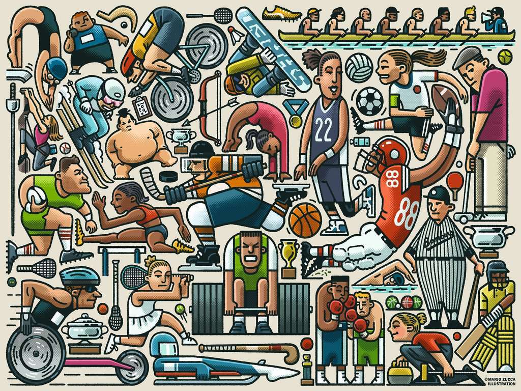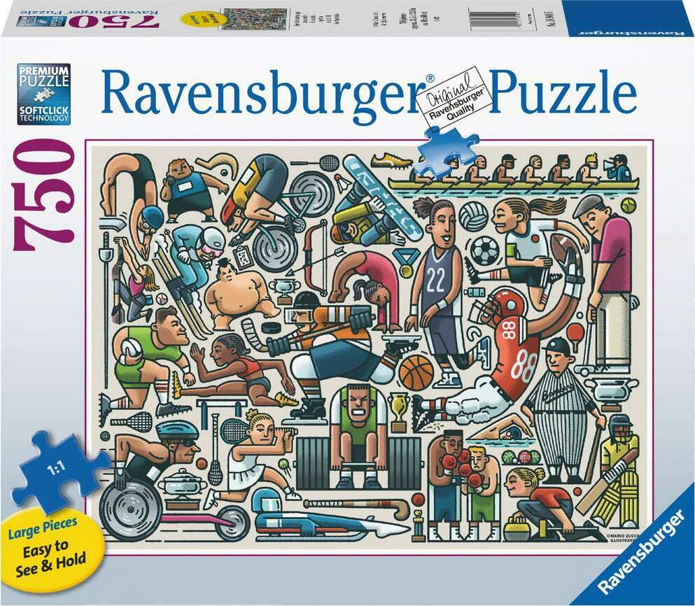 From baseball and basketball to hockey and hurdles, these athletes will power up your puzzling fun! Find your favorite sport; there’s boxing, climbing, crew, cricket, curling, cycling, diving, football, golf, gymnastics, luge, para-athletic racing, rugby, shot put, skiing, snowboarding, soccer, sumo wrestling, swimming, tennis, and weightlifting. A slew of sports gear makes it all fit, with field hockey, lacrosse, track, volleyball and more thrown into this clever sports-themed illustration!