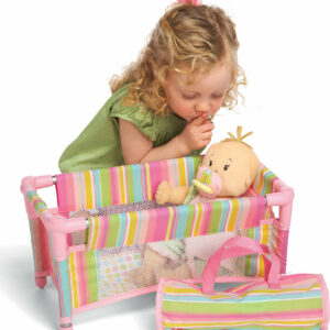 This portable Take Along Travel Crib is perfect for little ones to put their Baby Stella to bed. Fabric doll crib has metal poles and plastic joints that fit together for easy assembly. Also comes with a zippered carrying case to pack it all up so little ones can take it with them wherever they go. Adult assembly required.