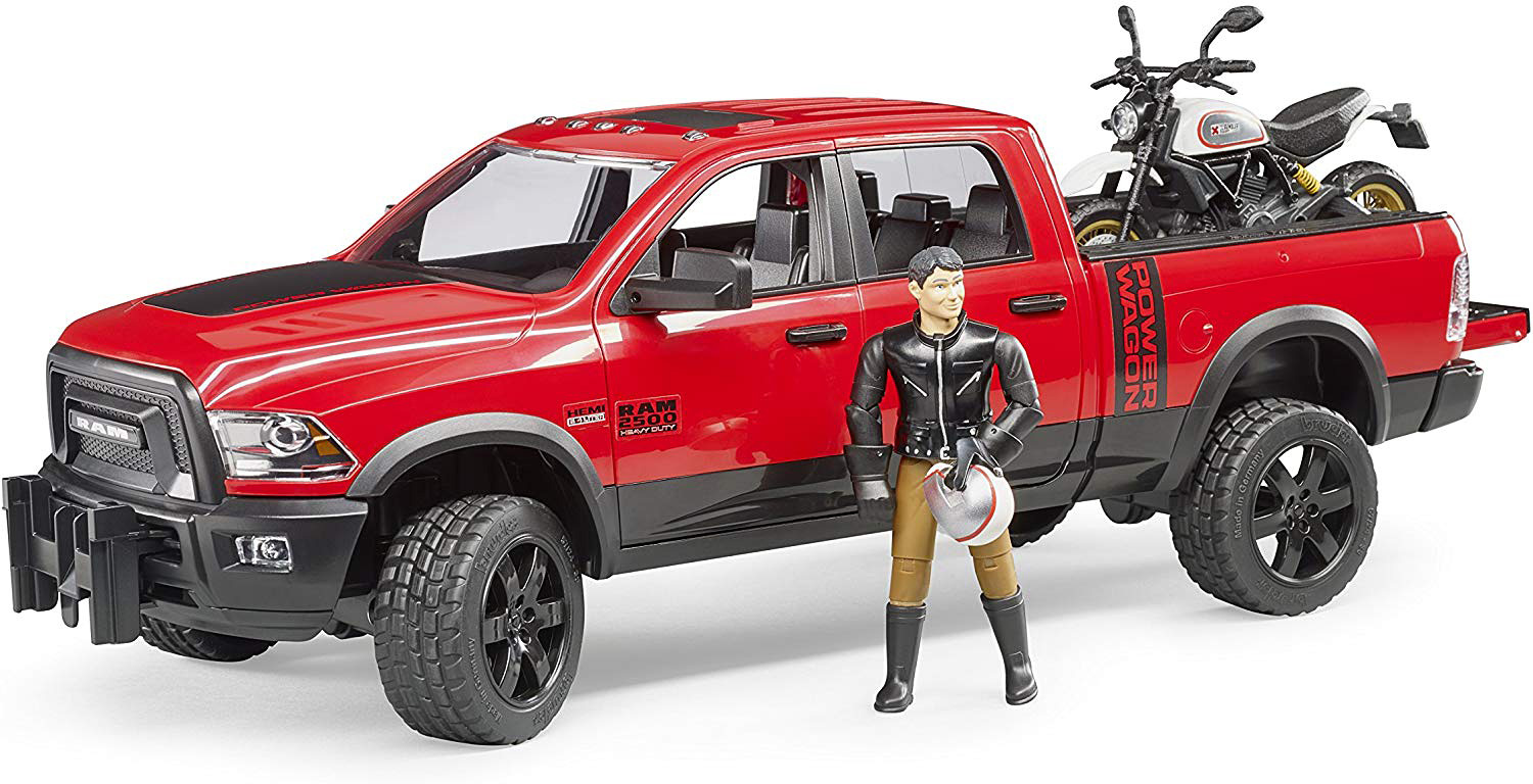 This appealing combination of RAM and Ducati Scrambler Desert Sled is a new addition to the BRUDER range. The RAM was made for off-road transport as it effortlessly carries the Ducati on its loading platform. Its durability and off-road capabilities are legendary and unique to this day. This vehicle is also very impressive in terms of output. Its V8 HEMI engine produces 410 BHP and generates a torque of 582 Newton metres. All doors open to accommodate four world figures. This model at a scale of 1:16 features suspension on both axles to provide ride comfort and off-road capability. In this context, the front axle can be steered using the included steering wheel extension.