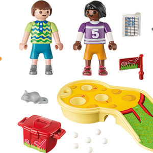 Accessories: 1 minigolf course, 1 flag, 2 minigolf clubs, 6 minigolf balls, 1 box with lid, 1 score block, 1 cap