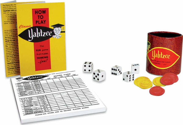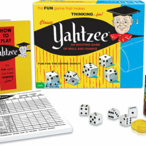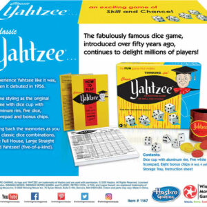 Experience Yahtzee like it was when it first debuted in 1956! The fabulously famous dice game, introduced over fifty years ago, continues to delight millions of players! Bring back memories as you roll classic dice combinations like Full House, Large Straight and Yahtzee (five-of-a-kind). Classic Yahtzee has the same styling as the original game with aluminum rimmed dice cup, five dice, scorepad, bonus chips, and storage tray.