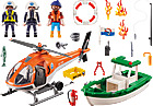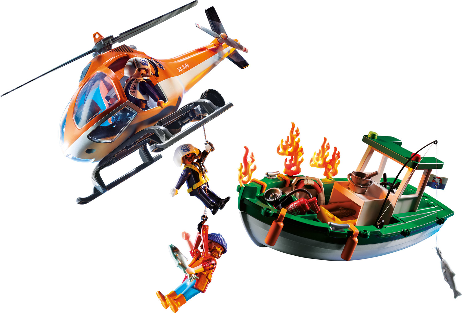 SOS! There’s a Coastal Fire Mission in progress to extinguish the boat fire and save the captain. The fisherman’s boat is ablaze, so the helicopter hovers overhead and the firefighter uses the rope winch to descend down to the boat. Once the captain is safely secured in the rescue harness, the helicopter speeds away from the danger zone. Set includes three figures, helicopter, rescue gear, floating fishing boat, fishing equipment, flames, fish, and many other accessories. Recommended for ages six years and up.