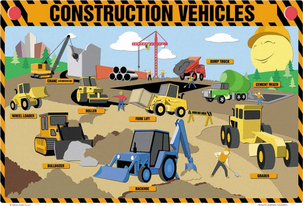 Construction Vehicle placemat offers a simplified view of a construction site and earth moving equipment