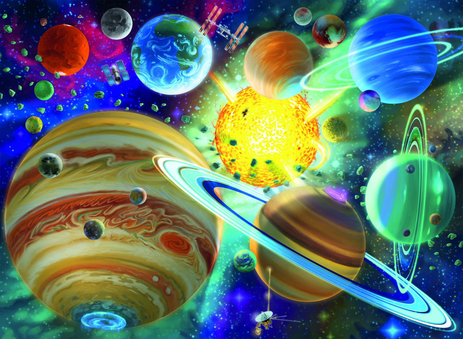 The people of earth have sent out many satellites and probes as we try to learn more about our solar system and what lies beyond it! Of course, we have eight planets (Mercury, Venus, Earth, Mars, Jupiter, Saturn, Uranus and Neptune). There are approximately 50 dwarf planets too, like Pluto and Ceres. Did you know our solar system also has more than 200 moons? Some we’ve included are Europa, Io, Charon, Triton, Oberon, Deimos and Phobos. Can you name more? A perfect puzzle for any astronomy buff!