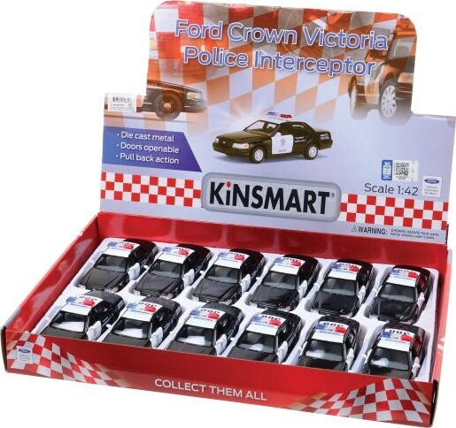 Open the doors to let perps into this die cast model police car. Pull back to send this car into action. Made of metal and plastic. Item 5″ L. x 2″ W. x 2″ T., 1:36 Scale replica.