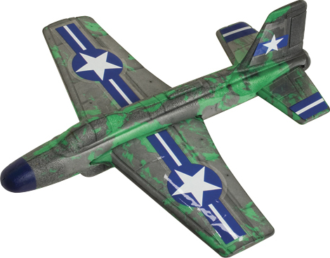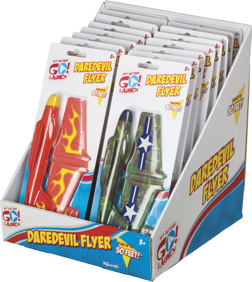 This top-selling, far-flying Launch Daredevil Flyer toy plane from Get Outside GO! comes in 4 styles. Colors and designs vary but may include a solid white, solid red, or green camouflage base accented with yellow flames, red stripes, or blue and white stars. Each 7-inch foam flyer can soar up to 50 feet and is individually packaged in a plastic peggable blister packet. Bend the wing flaps to make it perform aerial stunts in flight. 24 planes fit in colorful 9.06-inch x 8.27-inch display case.