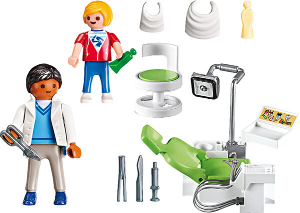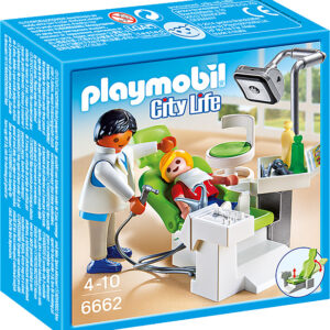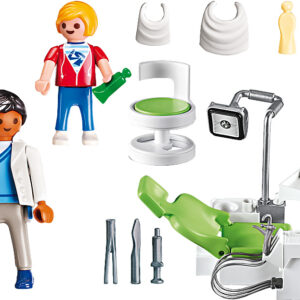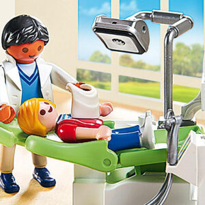 Search for cavities with the Dentist with Patient. The exam chair reclines so the doctor can see all the way to the back teeth, using the overhead light for help. The side table holds all the cleaning tools and toothbrushes. Set includes one adult figure, one child figure, exam chair, cleaning tools, doctor’s chair, and lots of other accessories. Combine this set with the Furnished Children’s Hospital (6657 – sold separately) for added play.