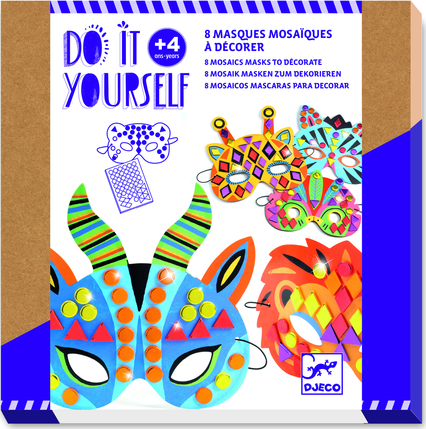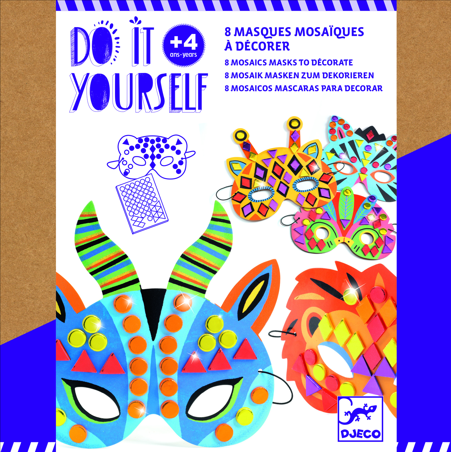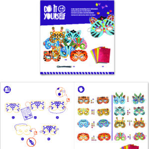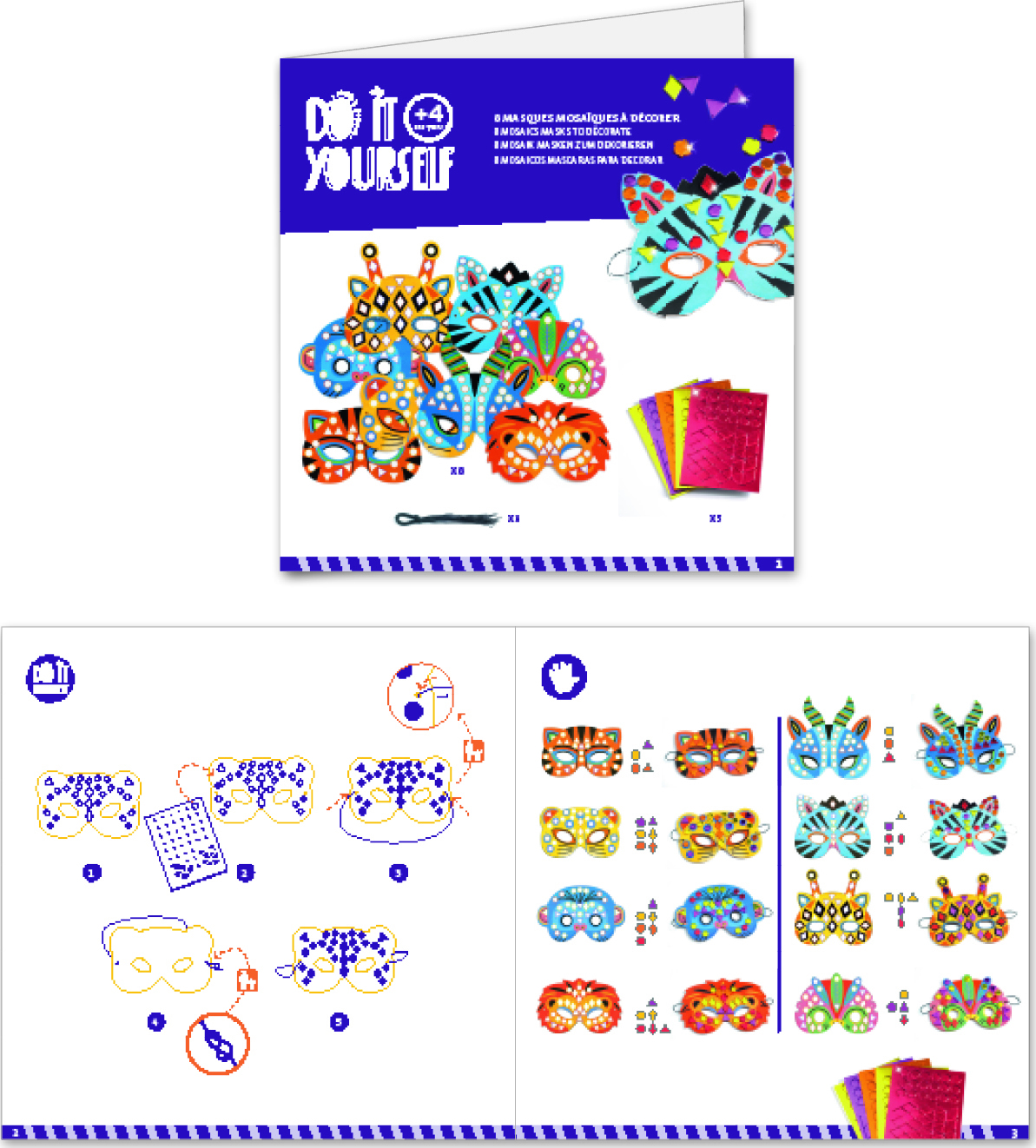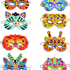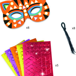 A creative kit with 8 jungle-animal-themed masks to decorate with mosaic stickers. Children pick a mask and attach the stickers by following the colour indicators.