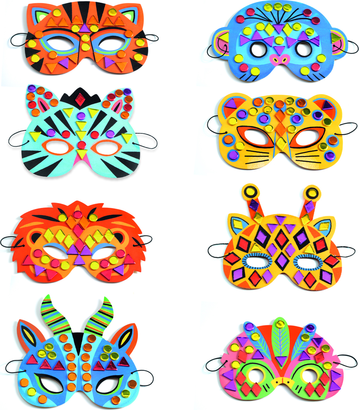8 jungle animal masks to decorate using the self-adhesive mosaic pieces provided.