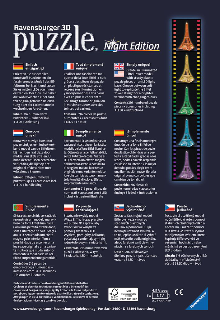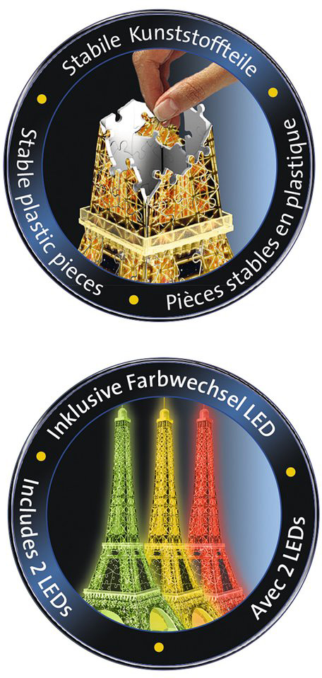 Construct one of the world’s most recognizable structures in illuminating 3D! Eiffel Tower by Night features 216 carefully-constructed plastic puzzle pieces, including curved and hinged pieces that interlock to create an 18 inch copy of this classic Parisian monument, complete with lights! Choose from gentle illumination or amazing changing colors. Start at the base and work your way up – display your finished model or disassemble and enjoy the challenge of building again.