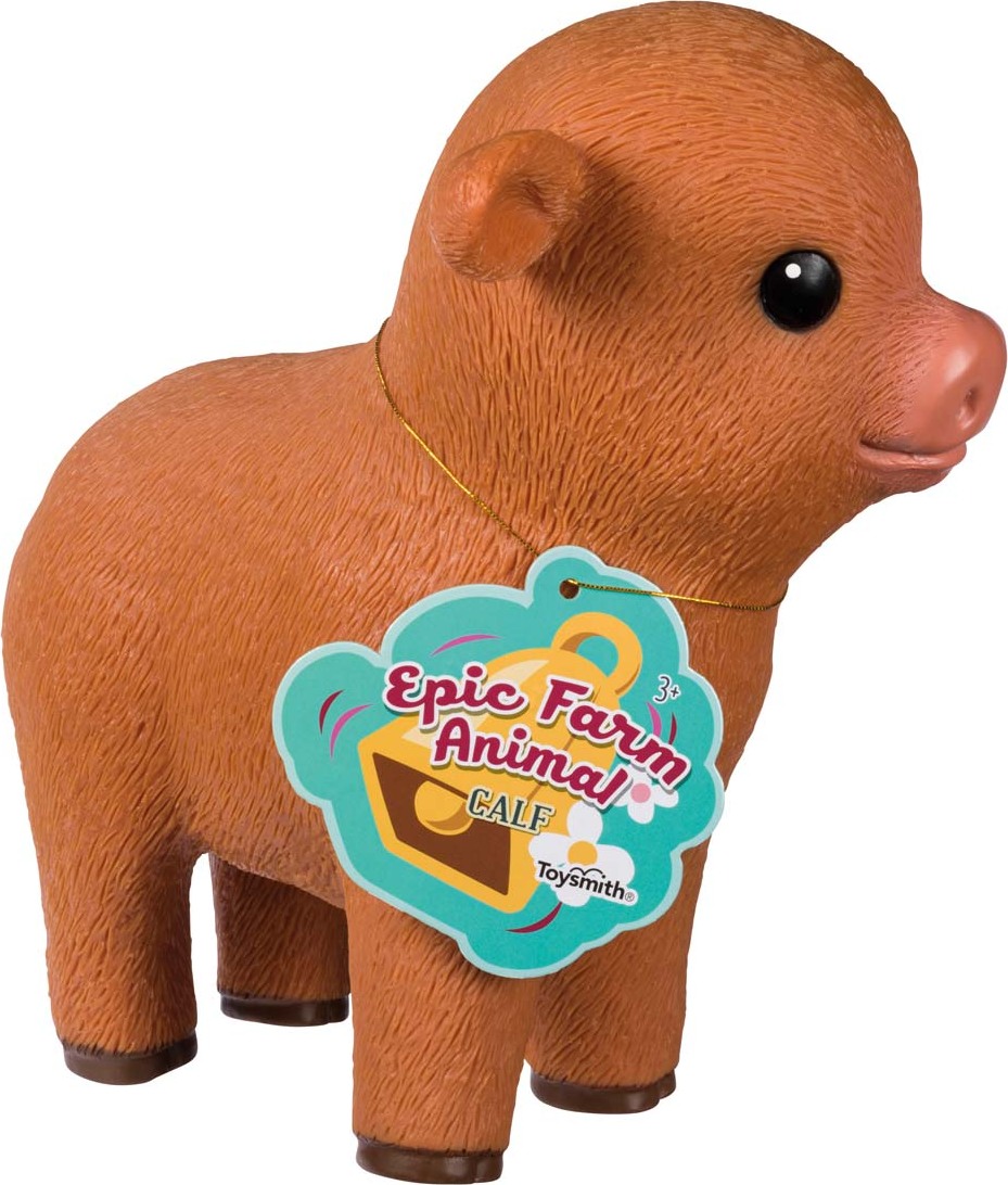 Fresh off the farm, this baby cow is crafted with authentic detail to create a lifelike toy. Made with high-quality soft plastic, this calf’s textured body, soft round eyes, cute little ears and tail, and pink-tipped nose, help safely and positively introduce kids to animals. This toy inspires imagination and works as a great learning or comfort tool. This calf toy is made of soft plastic that’s easy to clean and squeezable for cuddling.