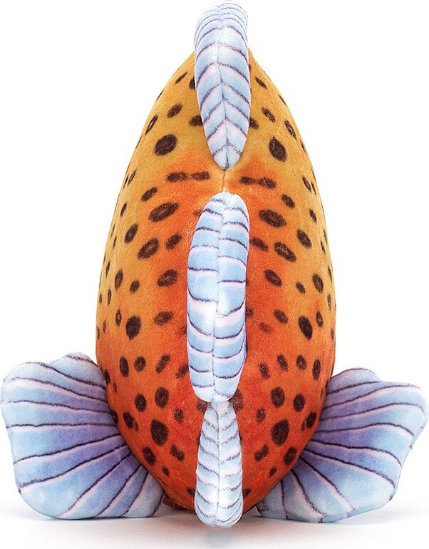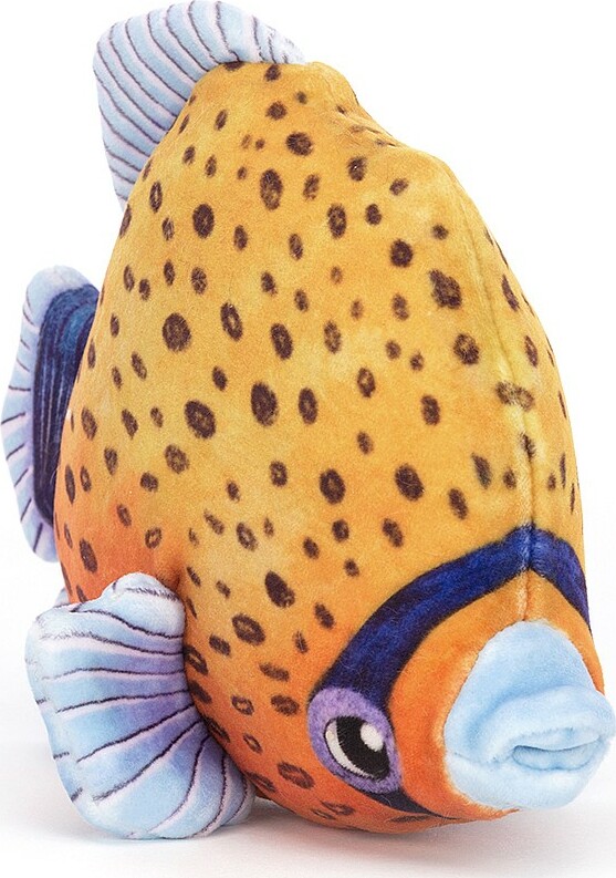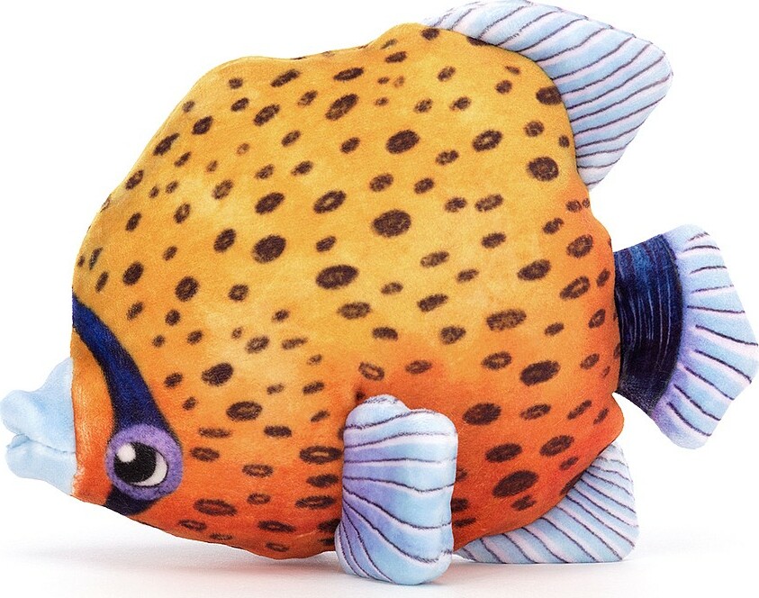Fishiful Orange is a riot of colour with stretchy-soft printed fur! Zany and zingy, this funky fish has cocoa freckles, ombre orange sides and baby-blue lips, with a bold navy eye band and multicoloured fins! Dreamy-eyed and perfect for drifting off with.