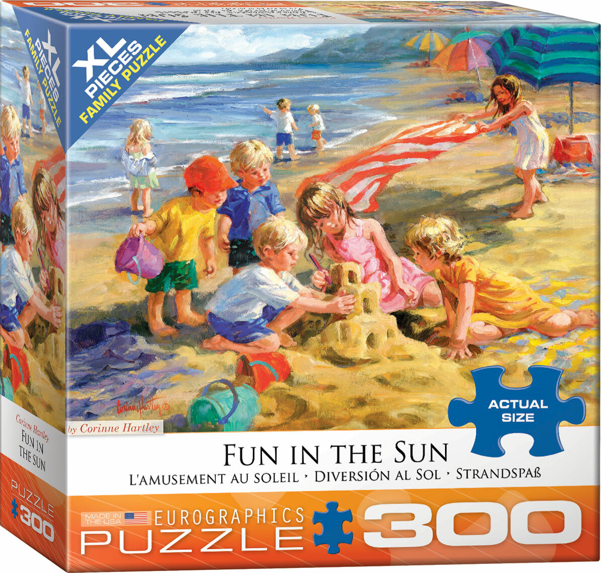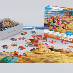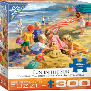EuroGraphics Fun in the Sun by Corinne Hartley 300-Piece Puzzle (Modular box). Box size: 8″ x 8″ x 2.37″. Finished Puzzle Size: 19.25″ x 26.5″(Same as Eurographics 1,000 pc.) A childhood afternoon at the beach making castles made of sand. Strong high-quality puzzle pieces. Made from recycled board and printed with vegetable based ink. This superior quality puzzle will delight and educate all at the same time.