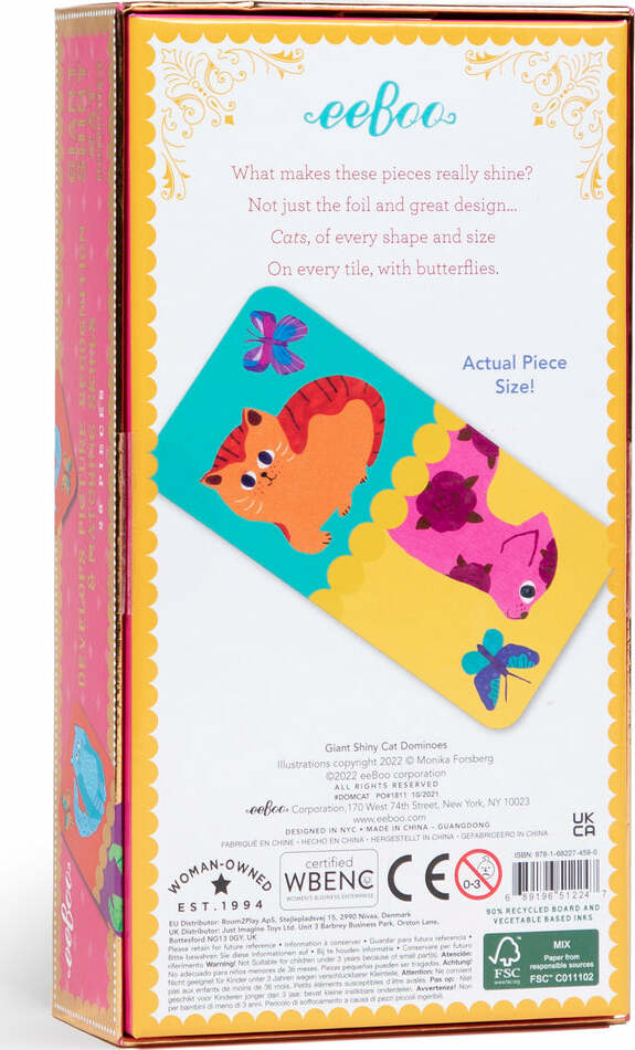 Giant Shiny Cat Dominoes will be sure to intrigue all feline lovers. Each die-cut domino piece features two fanciful cats with shiny gold foil highlights. The set includes twenty-eight dominoes that are 4.5 x 2.25 inches – a perfect size for young players. The classic game of dominoes develops matching skills and is one the whole family can enjoy together.