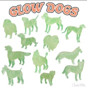 Groucho said, “Outside of a dog, a book is a man’s best friend. Inside of a dog, it’s too dark to read.” No more! This assortment of twelve different glow-in-the-dark, soft vinyl dogs, approximately 1-1/2″, makes canines a light source! This luminescent pack comes packed in a plastic bag.