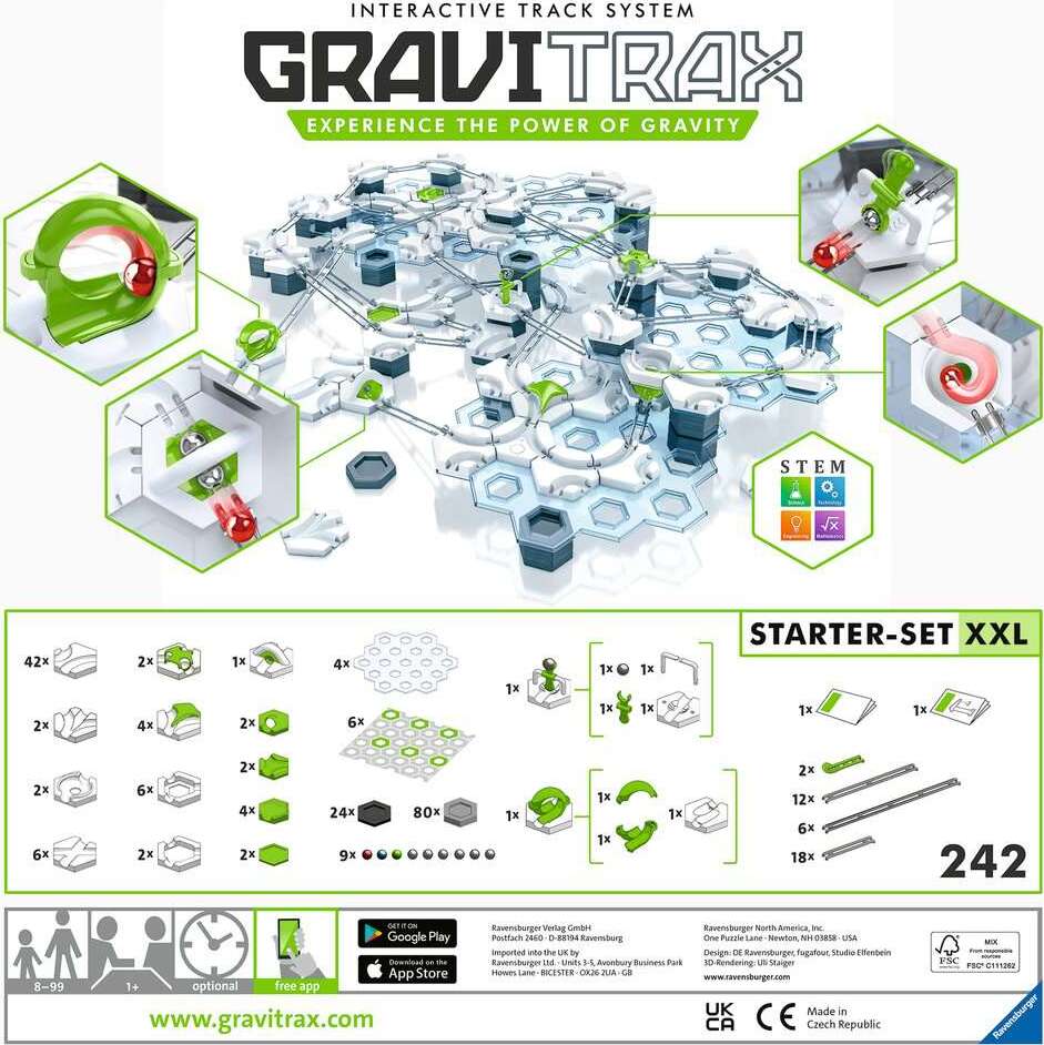 Go bigger and build mega-sized marble runs with the “GraviTrax Starter-Set XXL”! Easy to connect and build, our construction set includes 242 diverse pieces to create a ton of custom runs with curves, levels, freefalls and 3 action accessories; Magnetic Cannon, Hammer and Loop. Designed with open play in mind, it’s a snap to build a different track every time. Expand your track’s stunt action with extra accessories and experience the power of gravity and educational fun again and again!