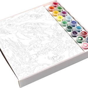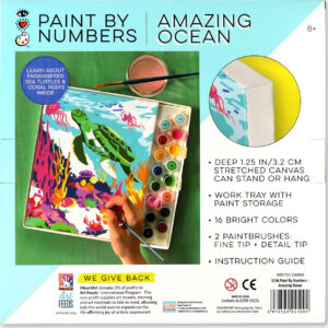 Paint By Numbers Amazing Ocean is designed for kids 8+. Beautiful ocean-themed artwork has enough detail to yield an impressive result. Create a stunning painting depicting a majestic sea turtle swimming among the coral reefs, and read facts about this endangered animal and its habitat with this paint kit for kids. Deep 1.25″ canvas can hang or stand, plus 16 colors of paint and 2 brushes. Clever tray pulls out to become your work station. It’s the best Painting By Numbers on the market! And as always, iHeartArt donates 5% of proceeds to Bright Stripes’ charity partner, Art Feeds, that supplies art lessons, training and art materials to kids in need.