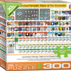 EuroGraphics Illustrated Periodic Table of Elements 300-Piece Puzzle (Modular box). Box size: 8″ x 8″ x 2.37″. Finished Puzzle Size: 19.25″ x 26.5″(Same as Eurographics 1,000 pc.) The complete illustrated periodic table of the elements, now in a fun and colorful puzzle format. Includes picture descriptions for better understanding!