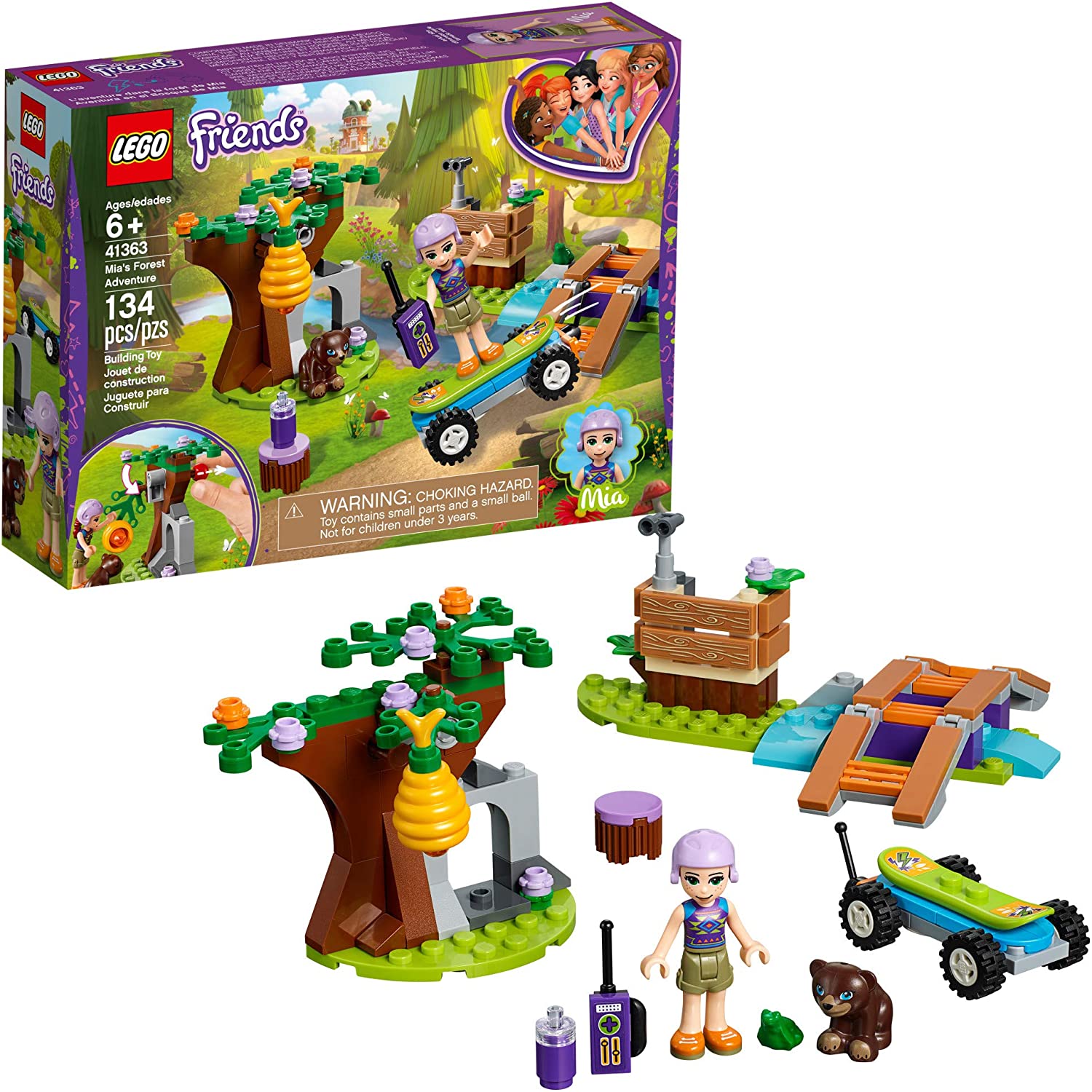 - This LEGO Friends animal set for creative play includes a Mia mini-doll figure, plus a LEGO Friends bear cub toy figure and a frog figure. It also includes an electric skateboard, lookout tower, bridge and a tree with drop-down beehive function