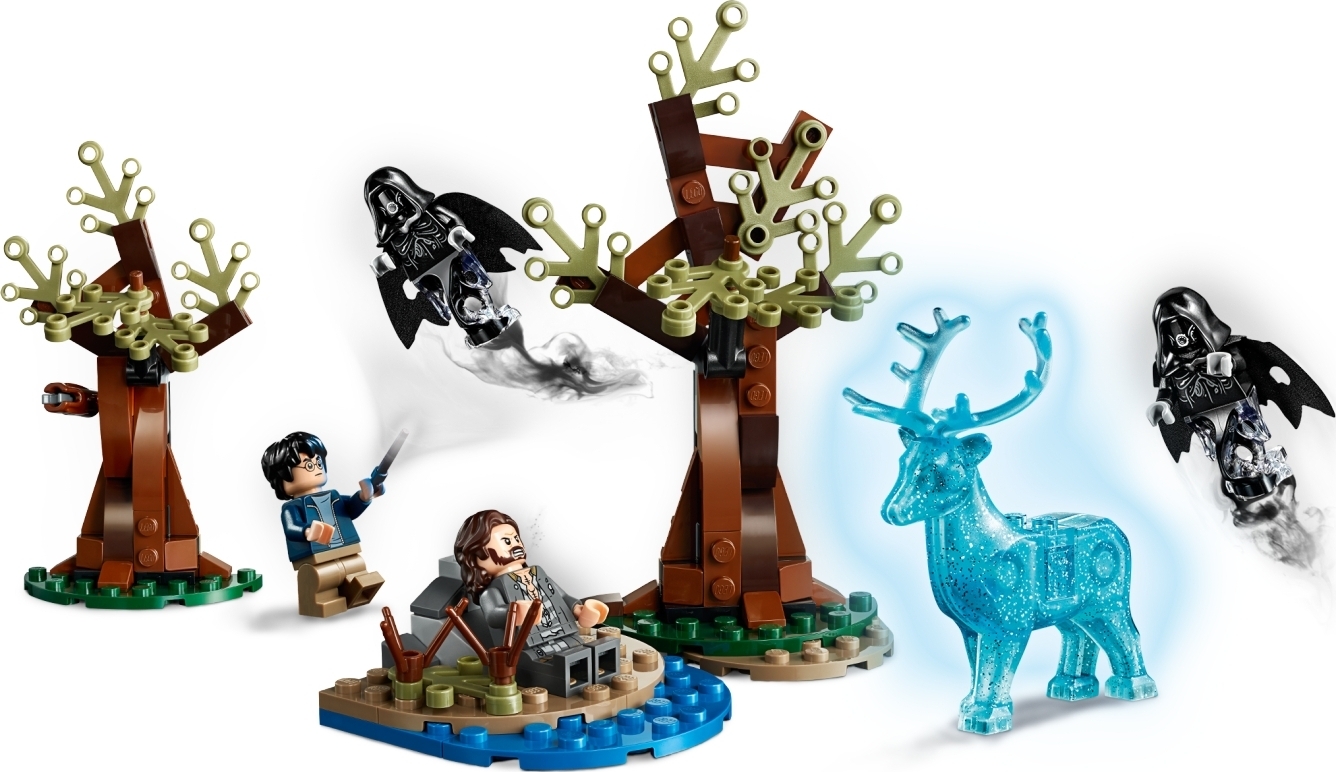 | Features | Includes 4 LEGO Harry Potter minifigures: new-for-June-2019 Harry Potter, new-for-June-2019 Sirius Black and 2 Dementors. This LEGO Harry Potter set features a forest scene with a small lakeside build and 2 buildable trees with a spell-cast shooting function, plus a new-for-June-2019 semi-transparent glittering stag figure with room for a minifigure on top. Also includes Harry's wand to cast the Expecto Patronum spell, as used in the Harry Potter and the Prisoner of Azkaban movie. Larger tree measures over 5” (13cm) high, 3” (8cm) wide and 1” (4cm) deep. Stag figure stands over 2” (7cm) tall. |