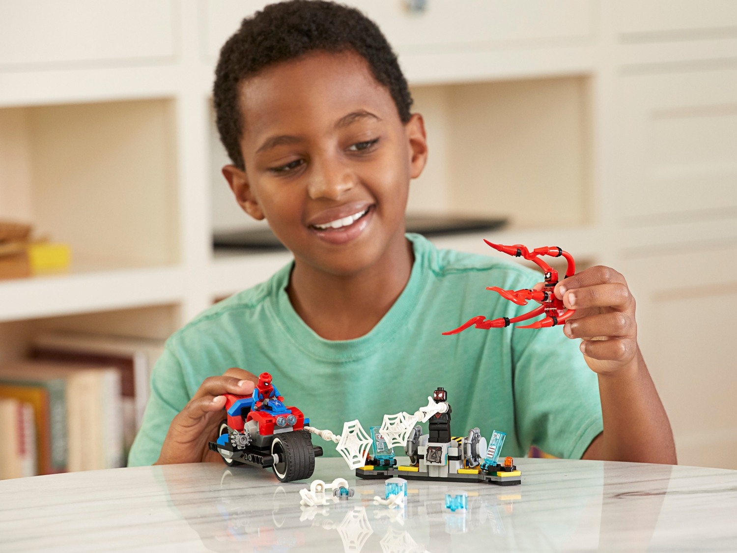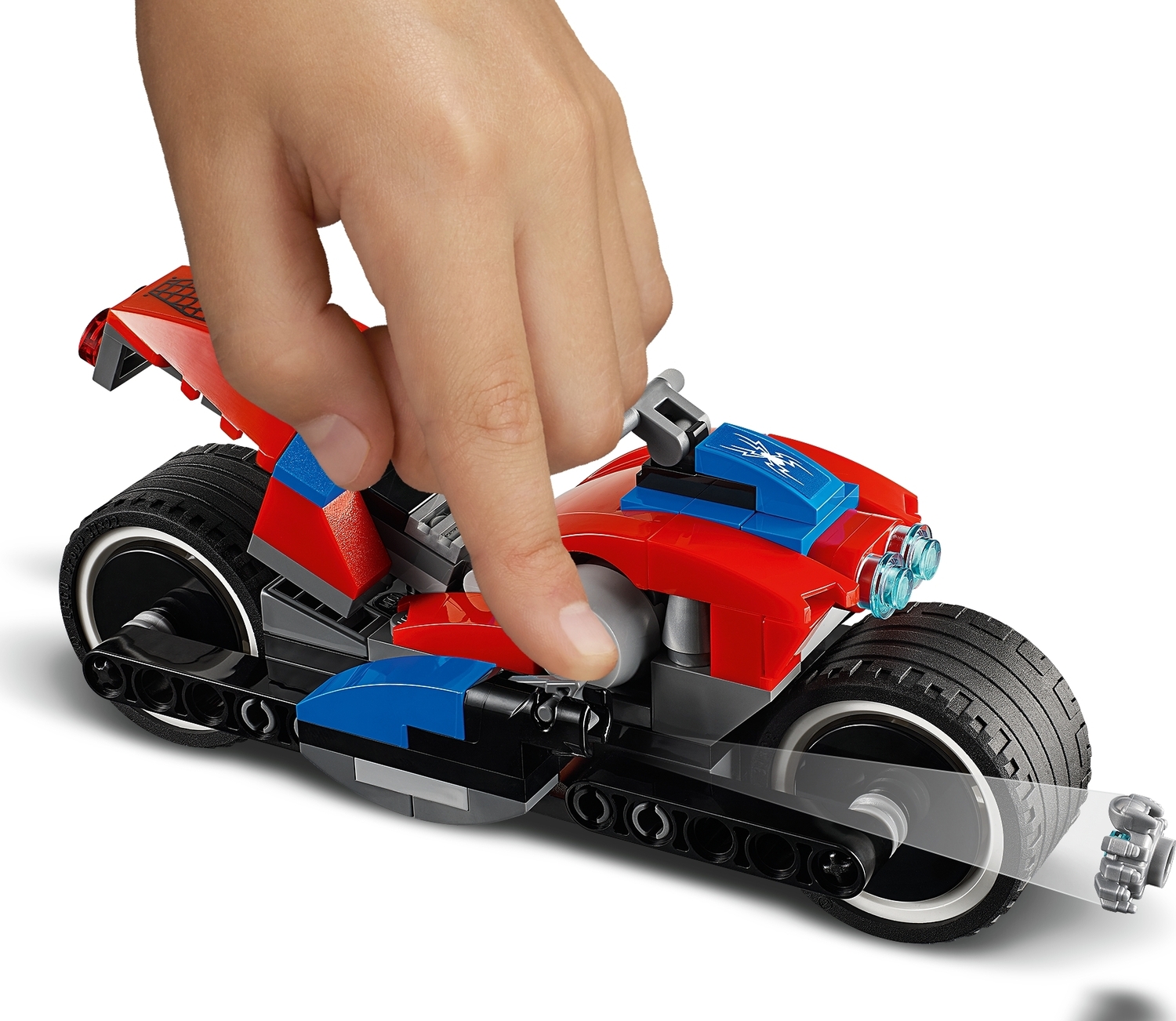 Spider-Man bike features a minifigure cockpit, adjustable handlebars, big wheels, tech spider shooter and a web gun (non-shooting) with attachment point for web elements.