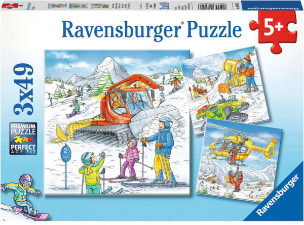 3 x 49 pc Puzzle Preschoolers love puzzles! More than just a puzzle box. There are 3 puzzles and 3 mini posters to use for reference. We have created the perfect selection for your pint-sized puzzlers, featuring engaging designs and Ravensburger’s high-quality, child-friendly formats. Ravensburger 3 x 49 piece Puzzles are a fun way to train recognition, logical thinking, patience, and hand-eye coordination. Puzzle difficulty when chosen correctly, strengthens your child’s self esteem and short term memory while having fun! Assemble the pieces to reveal 3 scenes from the slopes including heli-skiiers, snow blowers, and slope groomers! Since 1891 we’ve been making the world’s finest puzzles in Ravensburg, Germany. Our attention to detail has made Ravensburger the world’s greatest puzzle brand! We use an exclusively developed, extra-thick cardboard combined with our fine, linen-structured paper to create a glare-free puzzle image for a quality you can see and feel. Our steel cutting tools are designed and crafted by hand. This ensures that no two pieces are alike and guarantees a perfect interlocking fit. Enjoy Ravensburger quality with this family-friendly activity today! Since 1891 we’ve been making the finest puzzles in Ravensburg, Germany. It’s our attention to detail which makes Ravensburger the world’s greatest puzzle brand! We use an exclusively developed, extra-thick cardboard and combine this with our fine, linen-structured paper to create a glare-free puzzle image for a quality you can feel. Our steel cutting tools are designed and crafted by hand. This ensures that no two pieces are alike and guarantees a perfect interlocking fit.