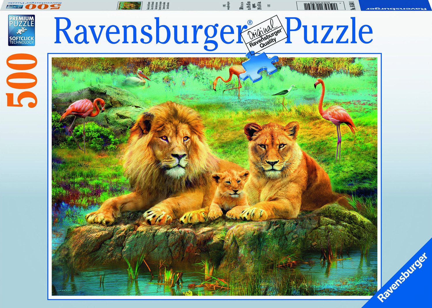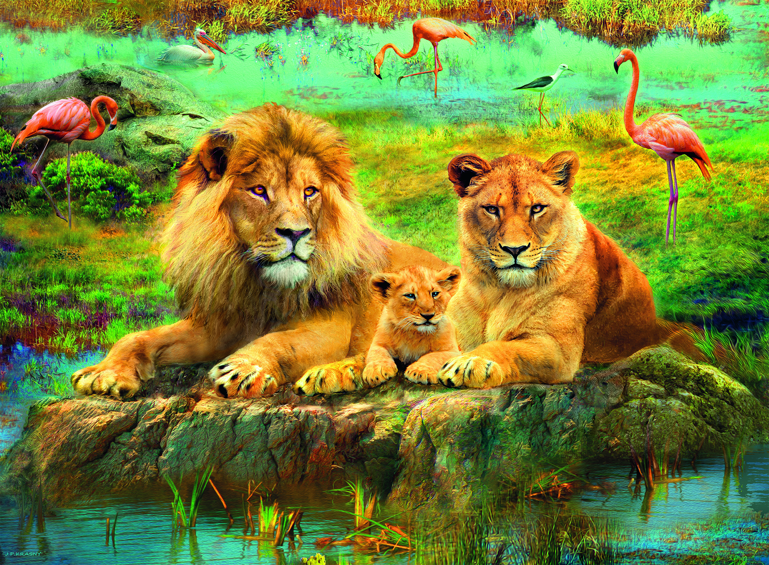 Our Lions in the Savanna puzzle depicts proud and protective parents guarding their young cub as they rest during the heat of the day. Home to some of the most distinct biodiversity in the world, the vast African savanna is one of the lion’s natural habitats. With refreshing water a lap away, and flamingos, a yellow-billed stork and other birds feeding behind them, this peaceful family portrait will surely be a pleasure to puzzle!
