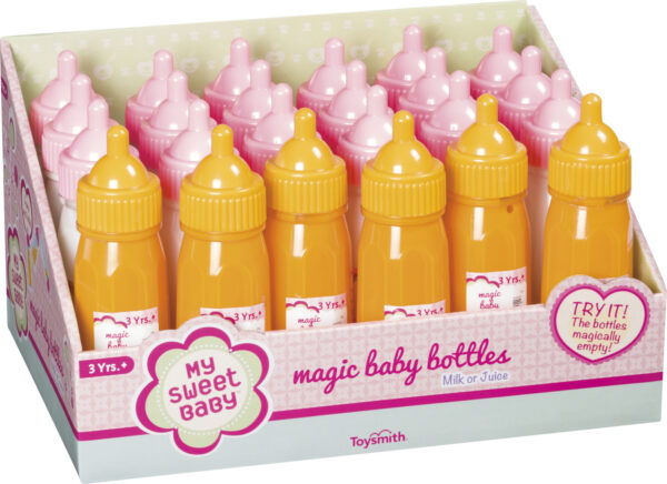 This assortment of Magic Baby Bottle toys from My Sweet Baby includes 2 drink styles with colorful liquid that disappears when tilted for feeding baby. Bottles refill when bottle is stood straight again. Liquid looks like milk or orange juice. Milk bottle is 4.75 inches tall. Orange juice bottle is 4 inches tall. Made with high-quality, nontoxic plastic and featuring lifelike designs and mL markings.