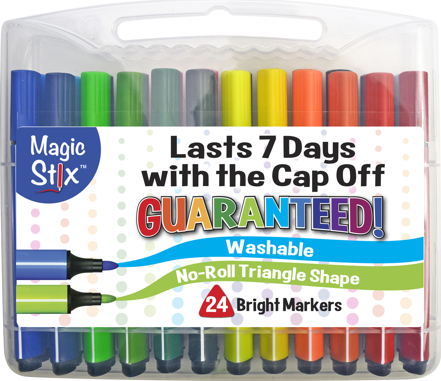 Featuring a never-roll triangular shape. Magic Stix markers are a revolutionary new product to bring safe, creative fun to your crafts! Magic Stix are guaranteed to bring long lasting color to the page with the cap off for up to 7 days without drying out. With 24 classic colors, these washable and non-toxic markers will remain fresh use after use, project after project.