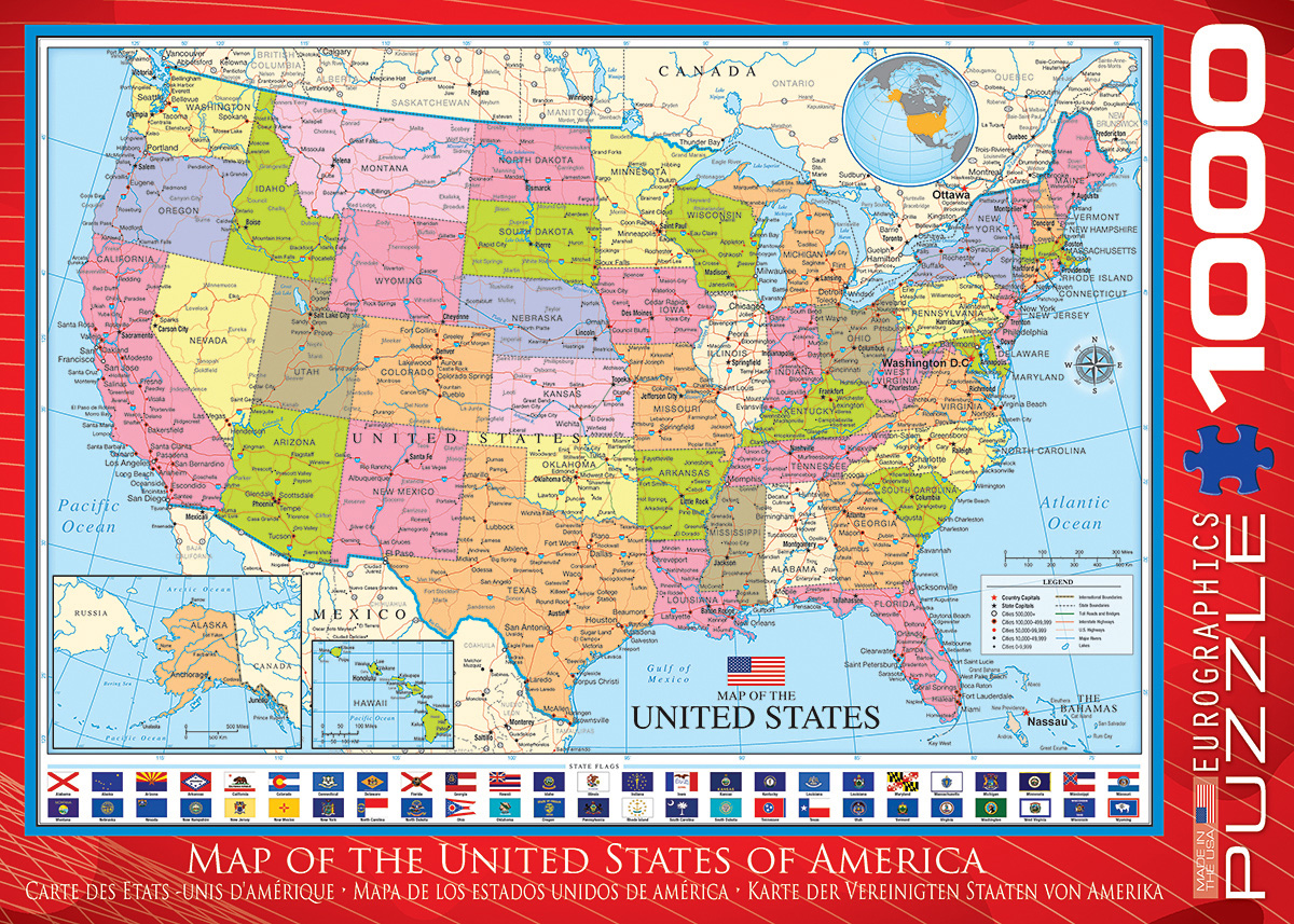 EuroGraphics Map of the United States of America 1000-Piece Puzzle. Box size: 10″ x 14″ x 2.37″. Finished Puzzle Size: 19.25″ x 26.5″. This educational map includes all major cities, as well as, the capital cities and state flags. Strong high-quality puzzle pieces. Made from recycled board and printed with vegetable based ink. This superior quality puzzle will delight and educate all at the same time.