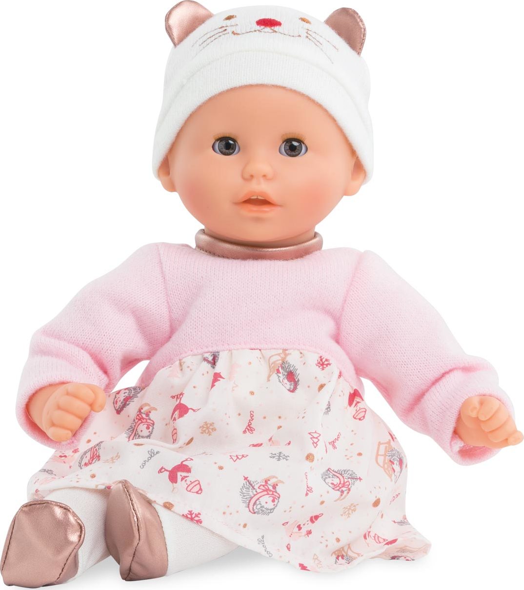 The doll’s face, arms and legs are made of soft vinyl that is delicately scented with vanilla, a Corolle signature. Bebe Calin Enchanted Winter is dressed in an all-in-one charming forest-animal print dress with a matching “hedgehog” cap.