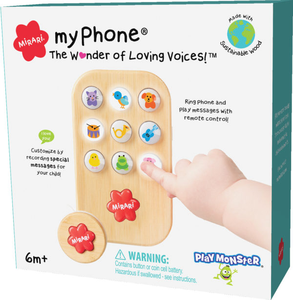 The 5″ phone features nine colorful light-up icons with fun phrases and sounds that activate when pressed. The red Mirari button activates an adorable giggle! The most exciting feature of this phone is its “record and ring” ability – mom or dad (or grandparents!) can record a personalized message on the phone for children. Then, using the included remote, parents can activate the phone ringer from across the room (unobstructed), and children will hear their loved one’s message! It’s a magical addition to fun phone play that children will adore! Both the toy phone and keychain remote feature a natural wood top for a modern, rich look and feel.