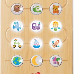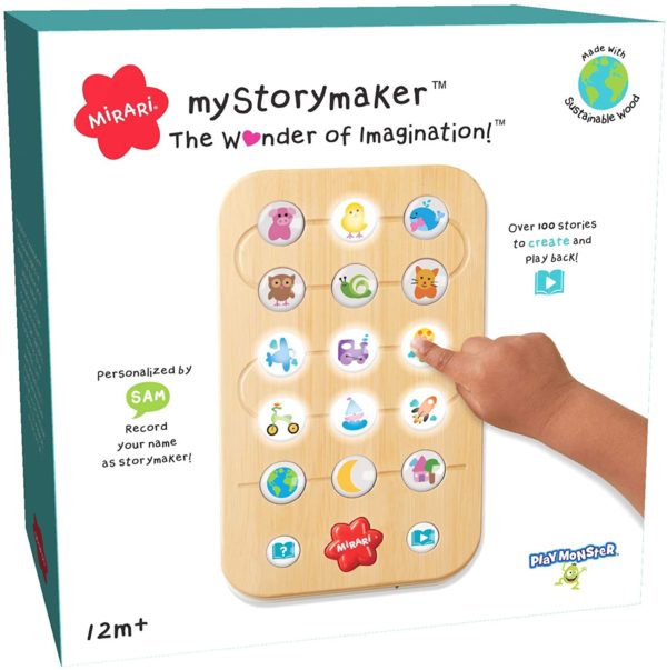The colorful icons allow children to create a story by pressing one from each section: hero, adventure and happy ending! Sections light up to guide children in creating their story. Children can create more than 100 different stories, and each one contains fun sounds and expressive voices to engage children. Pressing the Mirari logo triggers a lovable giggle and the narrator!Parents can also record the child?s name so the narrator will announce who made the story! Measures 5.75? x 9.5? and features a natural wood top for a modern, rich look and feel.