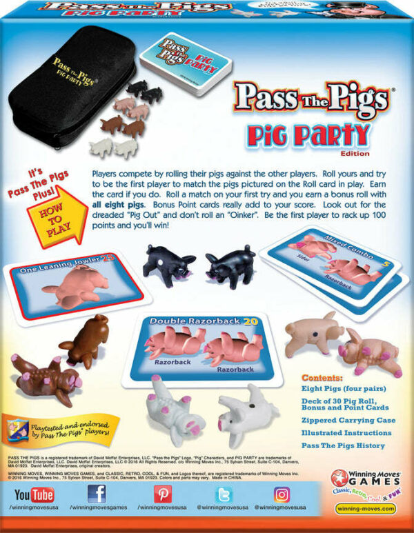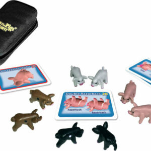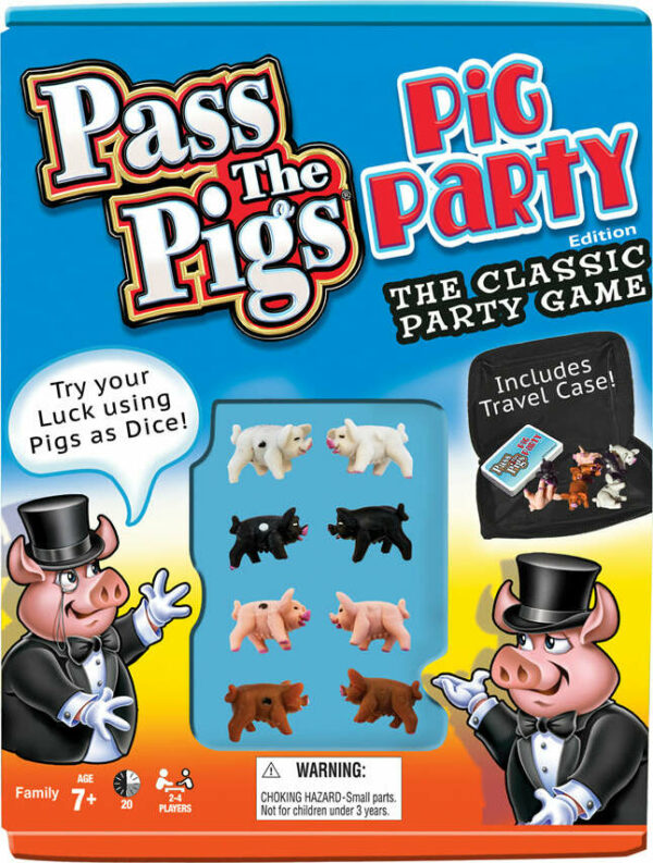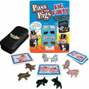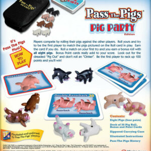 Hugh and Jack Pigfellow have invited their piggy friends to share the fun. Now there are eight pigs in the game! Two of these “party animals” are yours to roll against the others in this pigtastic new version of Pass the Pigs.