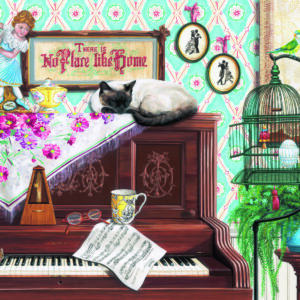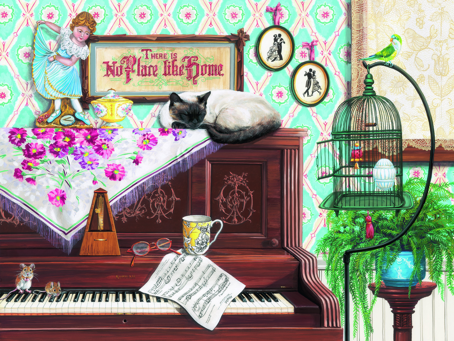 This timeless scene captures the Victorian charm of days gone by. Maximilian, the noble Siamese, lounges high on top of the piano, while the metronome ticks a lulling rhythm. Kiwi, the colorful Monk Parakeet, perches on top of his cage. While they’re friends, he keeps a watchful eye on Max; better safe than sorry! Mr. and Mrs. Mouse are checking for cake crumbs from tea time without much luck. Such a peaceful scene perfectly illustrates the adage, “There is no place like home!