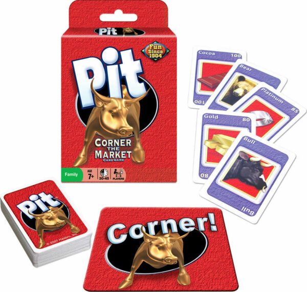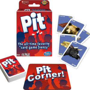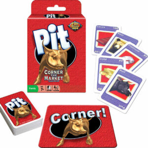 Shout your deal and trade your cards to “corner” the market. Be the first to get all the cards of one commodity, slap the “Corner!” board and you’ll win the hand. You’ll feel like a trader in the “pits” of the exchange! Beware of the Bear and take your chances with the Bull. PIT is great frenzied fun. Contains: 74 cards and “Corner!” board. For 3 to 8 Players. Note: Does not include bell.