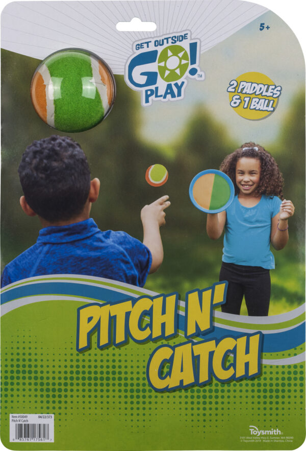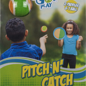 Make the play of the day with this super-easy pitch-and-catch 2-player set from Get Outside GOYAY! Each Pitch N’ Catch pack includes 2 7.5-inch circular hook-and-loop paddles with handles and 1 soft 2-inch ball. Paddles are bright neon, and the ball is two-toned. A great outdoor game, this pitching and catching set encourages movement and helps improve hand-eye coordination. Best suited for outdoor use. Packaged on clear plastic peggable card for easy display.