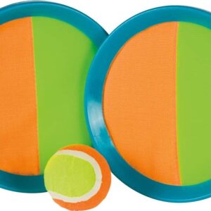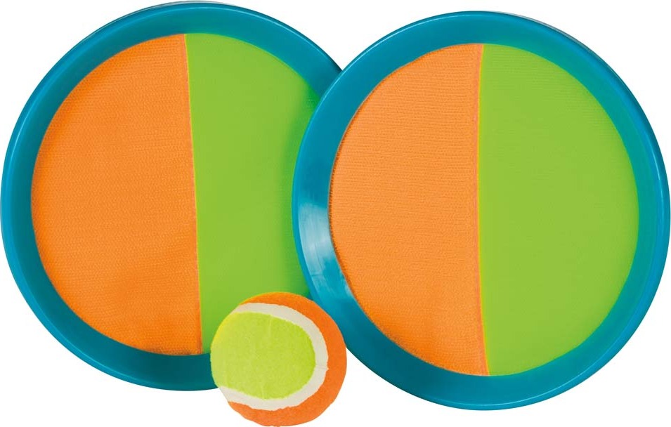 Easy to play and in eye catching colors, this hook and look catch set includes two 7.5in neon paddles and one 2in ball.