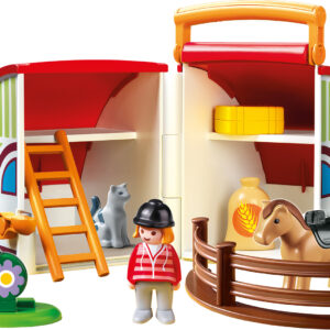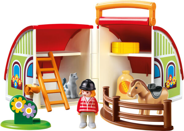 My Take Along Farm from PLAYMOBIL®-1.2.3 is perfect for children on the move. The horse wants to go out into the paddock. Here it has plenty of space to exercise and to catch some fresh air. The rider puts on her helmet and prepares for the ride. The cat watches her curiously as she gallops away, but then climbs up to the hayloft to sleep. All figures, animals and accessories are easily stowed away in the riding stable and carried away effortlessly in the suitcase.