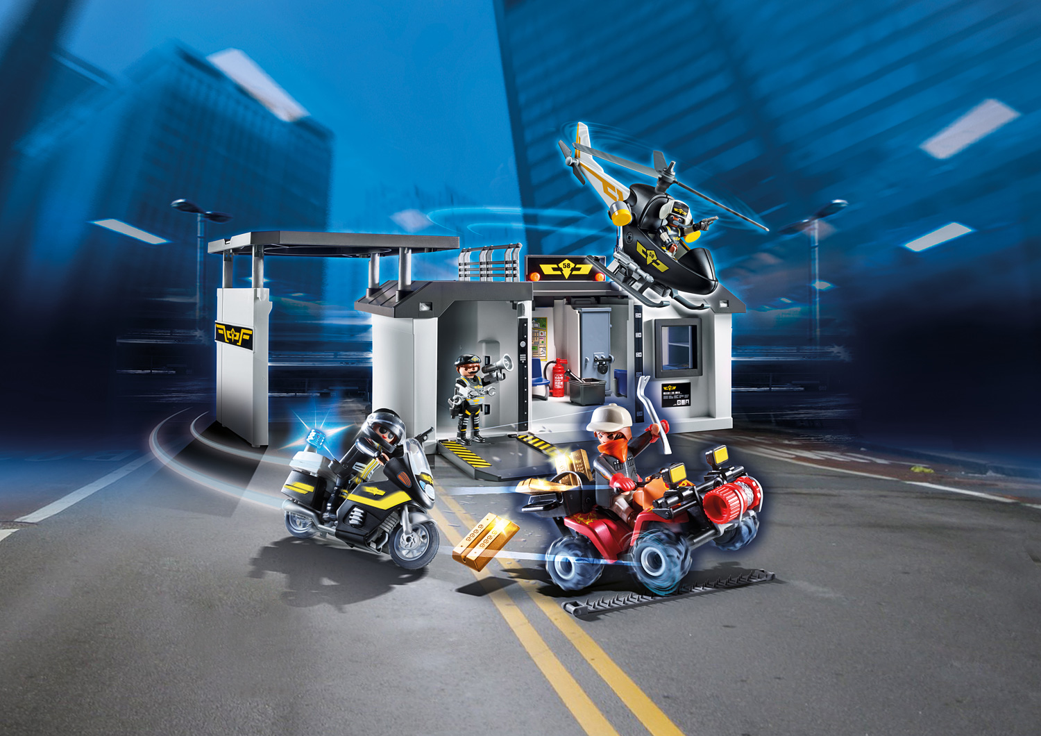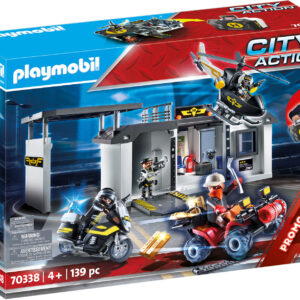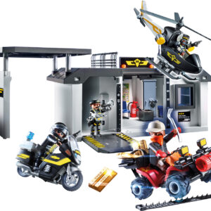 - Set includes four figures, headquarters, helicopter, motorcycle, quad, handcuffs, megaphone, gold bars, safe, flashlights, tire spikes, and other accessories