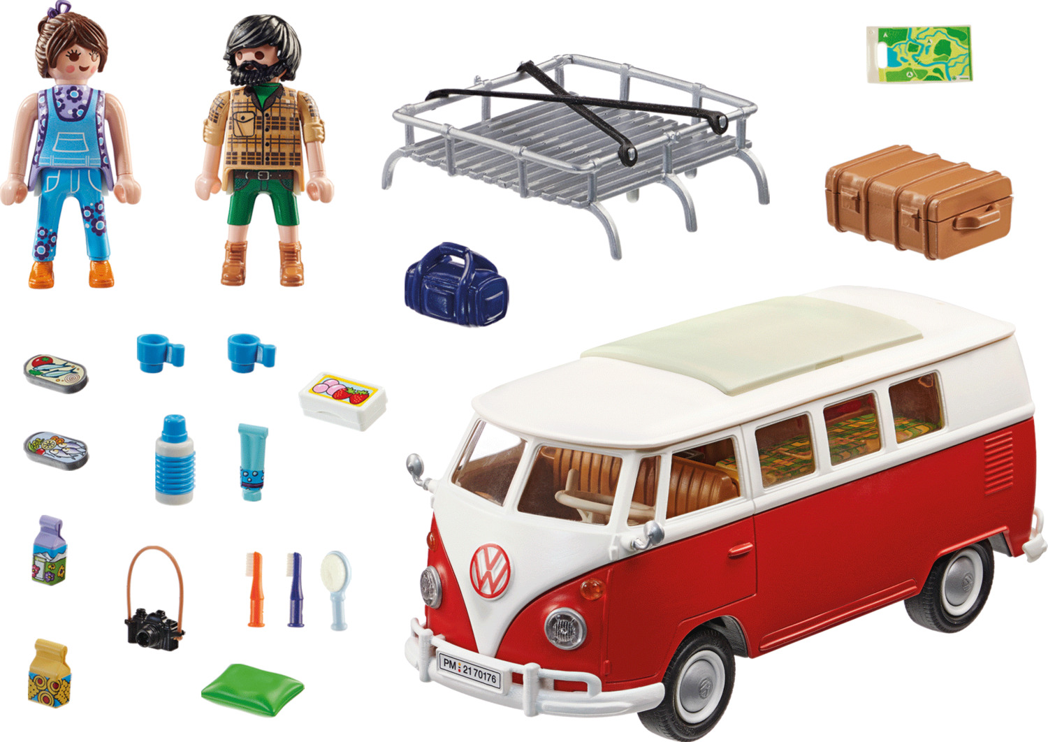 Accessories: 1 Volkswagen T1 Camping Bus, 1 luggage rack, 1 suitcase, 1 travel bag, 1 map, 1 camera with strap, 2 pillows, 1 bottle, 2 cups, 2 toothbrushes, 1 hairbrush, 1 tube, 2 cans of food, 1 bread box, 2 tetra packs