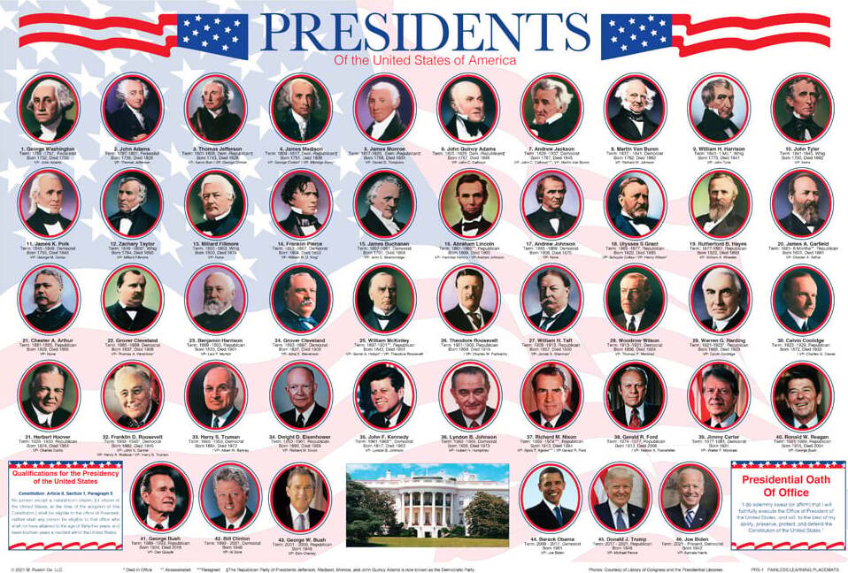 The Presidents placemat features a portrait of all 46 presidents with their dates of birth, death, dates in office, and political affiliation.