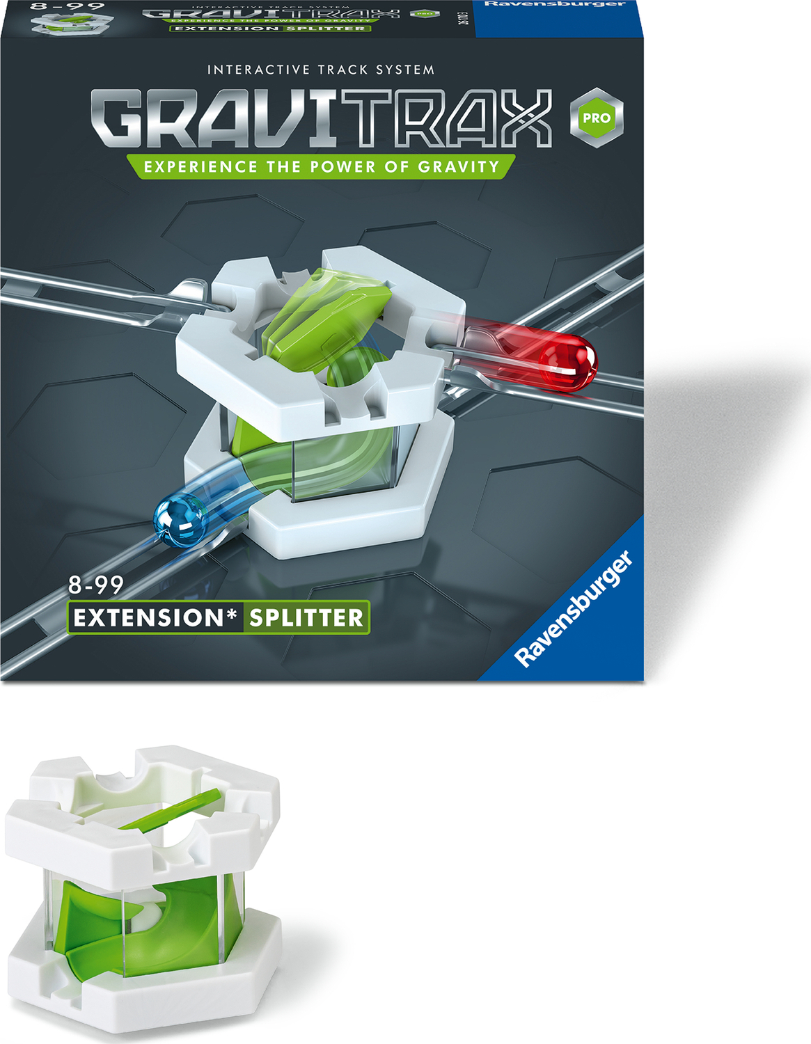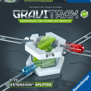 Split the directions of the marbles with the Splitter. See if the marbles have enough speed to roll across the trap door. If they roll too slow, the marbles will fall to awaiting tracks below and will go in different directions. Combine this accessory with any GraviTrax® Starter Set. GraviTrax is a modular interactive track system where you can design and build your own marble runs.