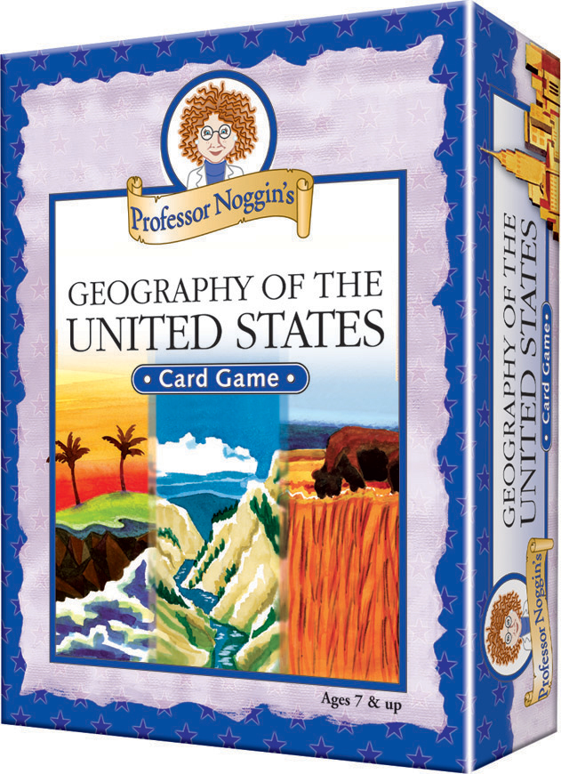 From rural farming communities to urban areas, from snow-capped mountains to tropical islands, this game covers both the natural and political geography of the United States. Learn about the states, cities, and natural geographical wonders that make this country such an interesting place to live. Professor Noggin’s series of educational games encourages kids to learn interesting facts about their favorite subjects! Each of the thirty game cards combines trivia, true or false, and multiple choice questions. A special three-numbered die is included which adds an element of unpredictability. Easy and hard levels keep kids interested and challenged-while of course having fun!