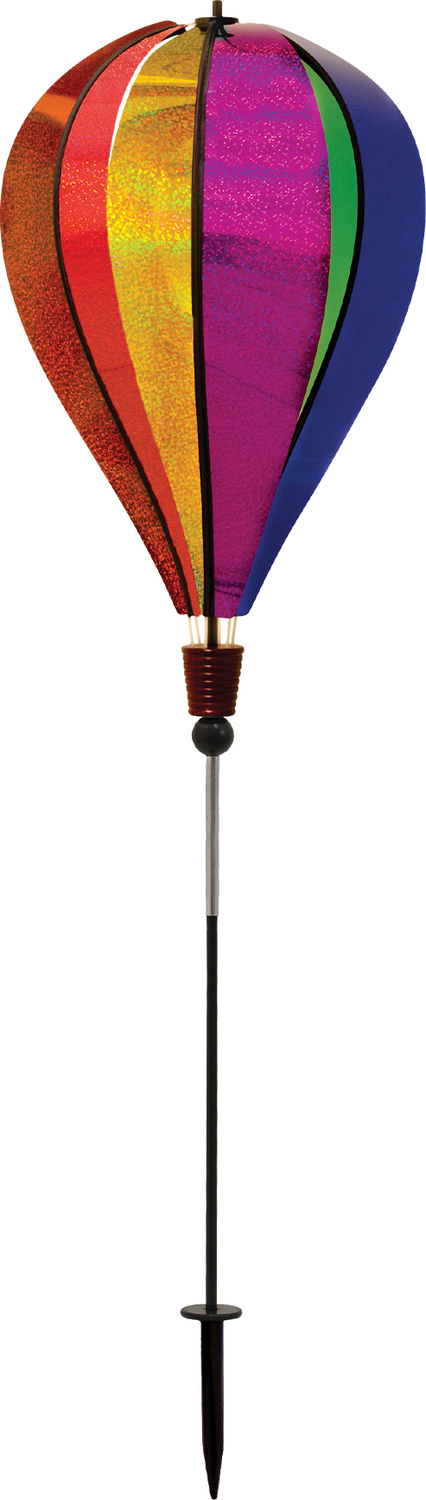 A Hot Air Balloon for the Garden! Made from stunning Mylar material in a rainbow of colors that throws sparkles in the sun. This Rainbow Glitter Hot Air Balloon Ground Spinner features a new hub and axle system that allows for smooth revolutions. The top plastic hub and basket rotate around a fiberglass axle which extends through the entire height of the balloon.