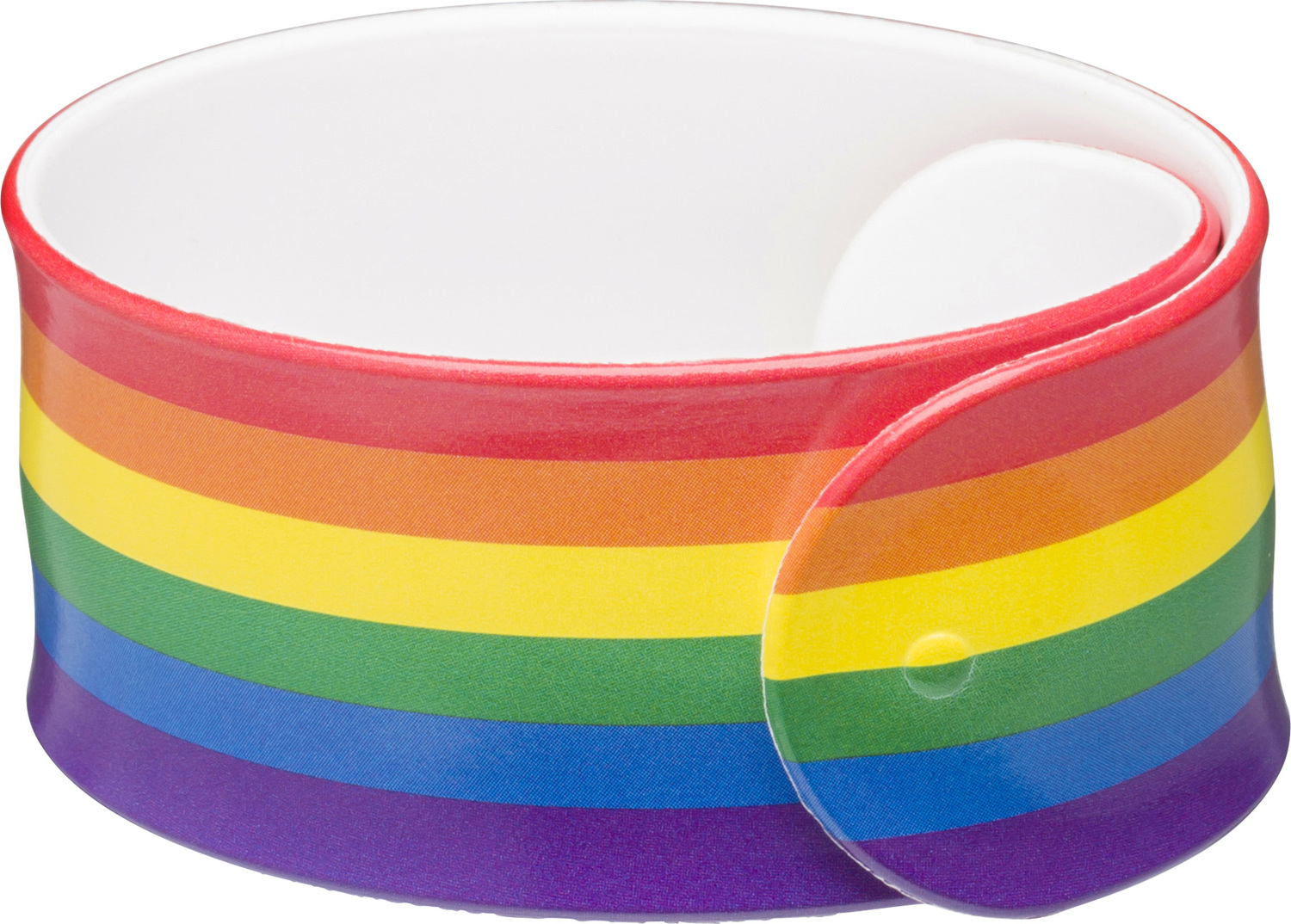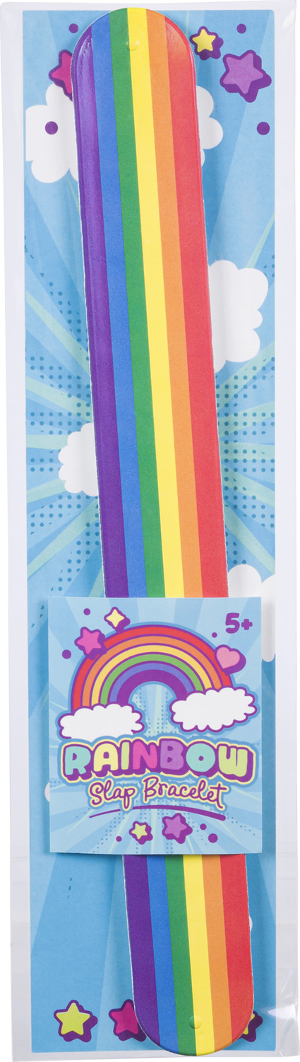 This rainbow-colored bracelet from Toysmith is a sassy, fun fashion accessory and nostalgic item. Fun for kids and adults alike, the Rainbow Slap Bracelet measures 8.5 inches long and is made of smooth, soft plastic. Each shiny bracelet includes long vertical stripes of red, orange, yellow, green, blue, and purple. One bracelet is neatly packaged in a clear plastic packet with a blue sky with white cloud illustrated card backing. Fits most wrist sizes. An assortment of 24 come with a 7.5-inch x 10.5-inch display case.