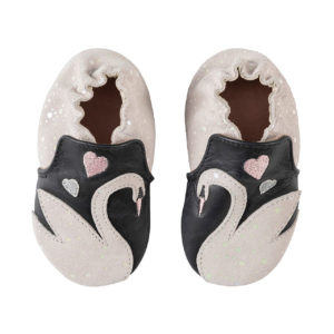 Pearlized suede and black leather swan with pink suede soles. Featuring a suede bottom & room to grow, they’re flexible with movement & non-constricting for better balance and stay on, play on power.